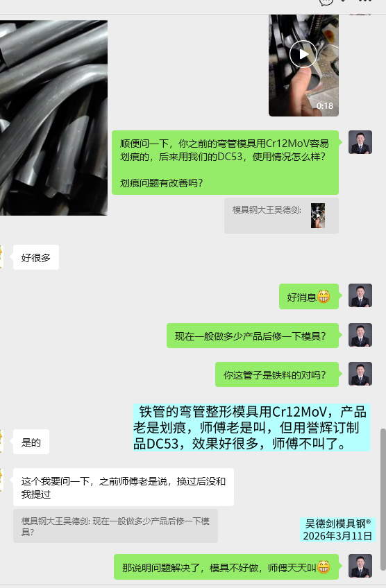 老客户胡先生,今早来买8566模具钢,借此机会,我询问他,顺便问一下,你之前的弯管模具用Cr12MoV容易划痕的,后来用我们的DC53,使用情况怎么样?划痕问题有改善吗?