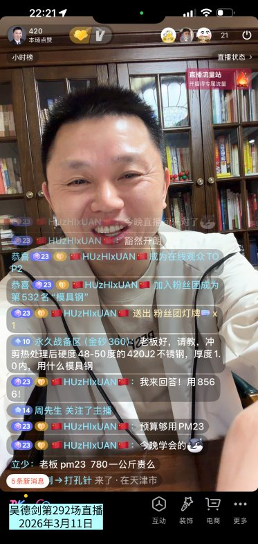 第292场直播间网友提问:老板好,请教,冲剪热处理后硬度48-50度的420J2不锈钢,厚度1.0内,用什么模具钢?