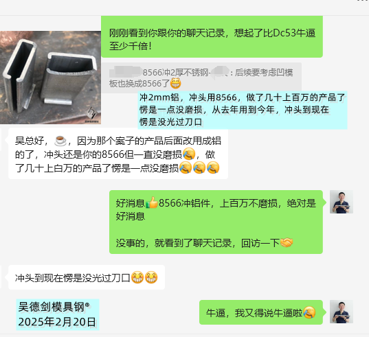 我们深圳的齐先生,他冲压2mm厚的铝板,冲头用8566模具钢,做了几十上百万的产品了,愣是一点没磨损,从去年用到今年,冲头到现在,愣是没光过刀口。模具钢选对路了,冲压铝板,冲头是很耐冲的。