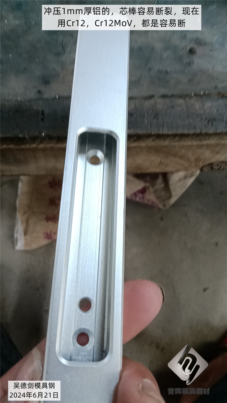 周先生是冲压铝型材产品的,在铝型材的侧壁有冲压很多个孔,而且两边孔还不对称,孔的数量也不对等,现在14mm见方的芯棒,试过弹簧钢、Cr12MoV、DC53、四抄LG,都是要断,各种硬度都调试过了,没法解决,实在想不出再用什么模具钢了,也不知道怎么选材了,就来誉辉模具钢跟我面谈。
