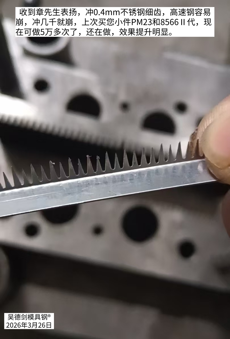 收到章先生表扬,冲0.4mm不锈钢细齿,高速钢容易崩,冲几千就崩,上次买您小件PM23和8566Ⅱ代,现在可做5万多次了,还在做,效果提升明显。