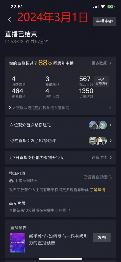 本场直播有2个新的数据,观看人数那里有个官方扶持+64,57条热评,昨晚的在线人数,很多时候都保持在20~24人之间,这个数据也比以前多,这3点都是好反馈,难到是官方开始扶持了,有新苗头了,朋友圈的高人,帮忙指点一下迷津。