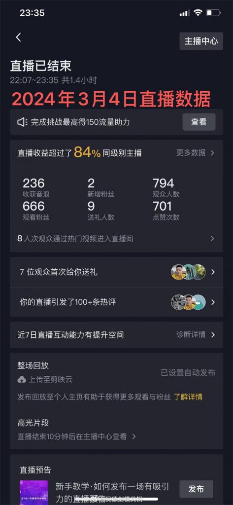 2024年3月4日的直播结束,今晚播到23:35才下播。