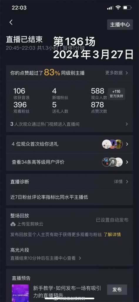 2024年3月27日的1小时直播结束,今晚是我的第136场直播。