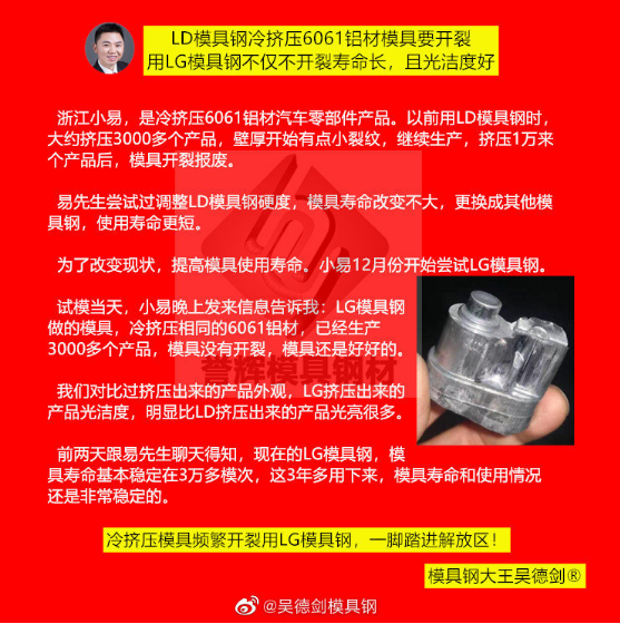 为了改变现状,提高模具使用寿命。易先生12月份开始尝试LG模具钢,试模当天晚上就发信息告诉我说:LG模具钢做的模具,冷挤压相同的6061铝材,已经生产3000多个产品,模具没有开裂,模具还是好好的。我们对比过挤压出来的产品外观,LG挤压出来的产品光洁度,明显比LD挤压出来的产品光亮很多。