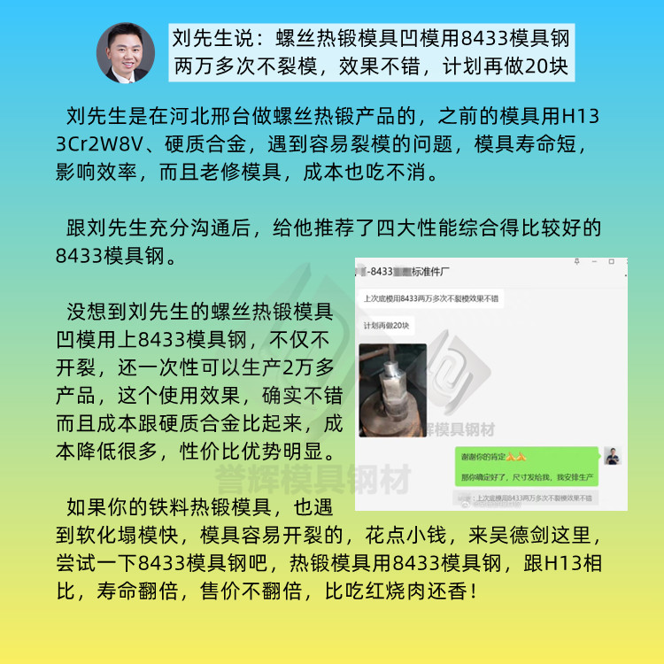 跟刘先生充分沟通后,给他推荐了耐热钢8433模具钢。没想到刘先生的螺丝热锻模具凹模用上8433模具钢后,不仅不开裂,还一次性可以生产20000多产品,寿命大幅延长。