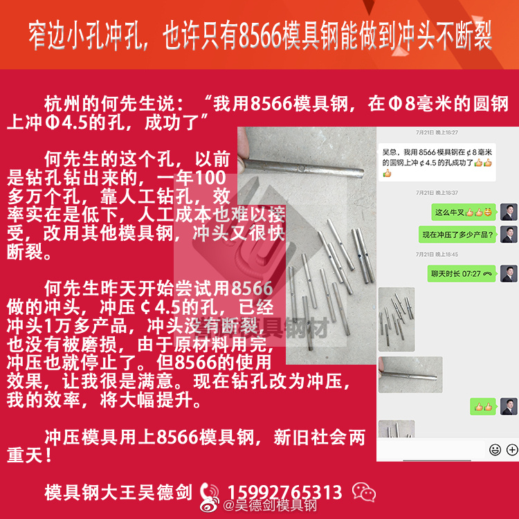 杭州的何先生说,我用8566模具钢,在直径8mm的圆棒上冲4.5的孔,成功了。冲头崩裂用8566模具钢,新旧社会两重天,这是过千用户的心声和呐喊。