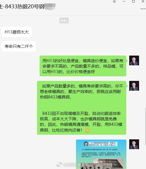 8433因不出现塌模及开裂,自动化锻造效率极高,成本大大下降,也许模具钢就是免费的,热锻45钢,模具用8433模具钢,修模4次,模具寿命也不减,每次都在10000模次以上,可以这么说,热锻模具遇塌模、开裂,用8433模具钢,比吃红烧肉还香。