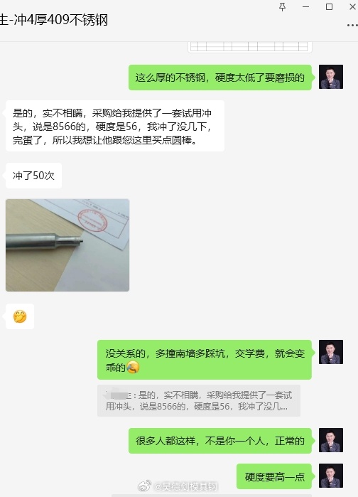 立马得到回复说:是的,实不相瞒,采购给我提供了一套试用冲头,说是8566的,硬度是56,我冲了50下,就完蛋了。