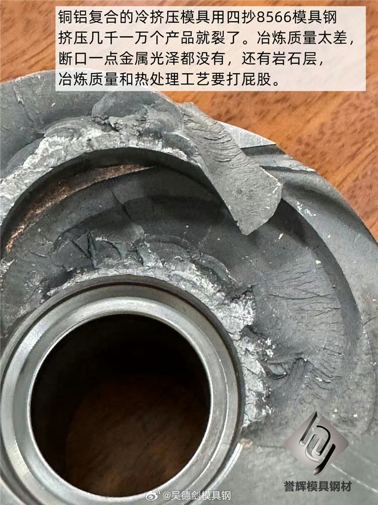 老客户咨询,冷挤压铜铝复合模具,用四抄8566,挤压几千一万个产品就裂了,模具直接被掀翻了,问铜铝复合模具要用什么模具钢不开裂。