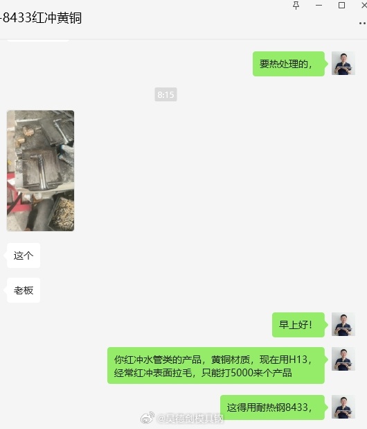 热锻模具遇塌模、开裂,用8433模具钢,比吃红烧肉还香。于先生的黄铜红冲模具用H13,5000次就拉毛,那更是应该用耐热钢8433模具钢,来延长模具寿命,提高表面质量。