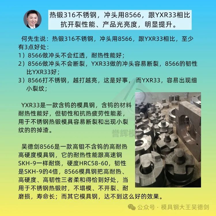 上次说,热锻不锈钢,冲头用8566模具钢,跟YXR33相比,至少有3点好处的何先生,又来采购8566模具钢
