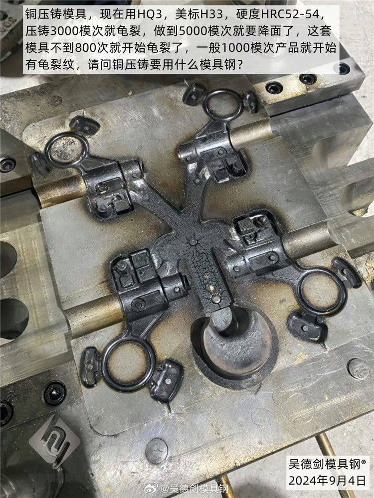 了解后得知,现在的铜压铸模具,现在用HQ3,美标H33,硬度HRC52-54,压铸3000模次就龟裂,做到5000模次就要降面了,这套模具不到800模次就开始龟裂了,一般1000模次开始,产品就有龟裂纹,请问铜压铸要用什么模具钢?