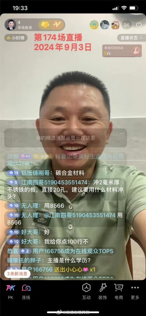 听得多了,直播间网友也会推荐模具钢,也能回复网友提问,为他点赞。