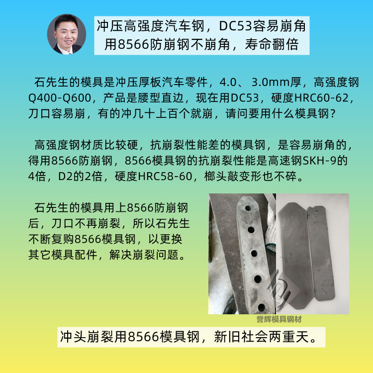 石先生冲压3~4mm厚高强度钢的腰型直边产品,现在用DC53模具钢,硬度HRC60-62,但容易崩口,冲几百个产品就崩口,但后来用8566防崩钢后,就不再崩口,所以石先生一直在采购8566防崩模具钢。
