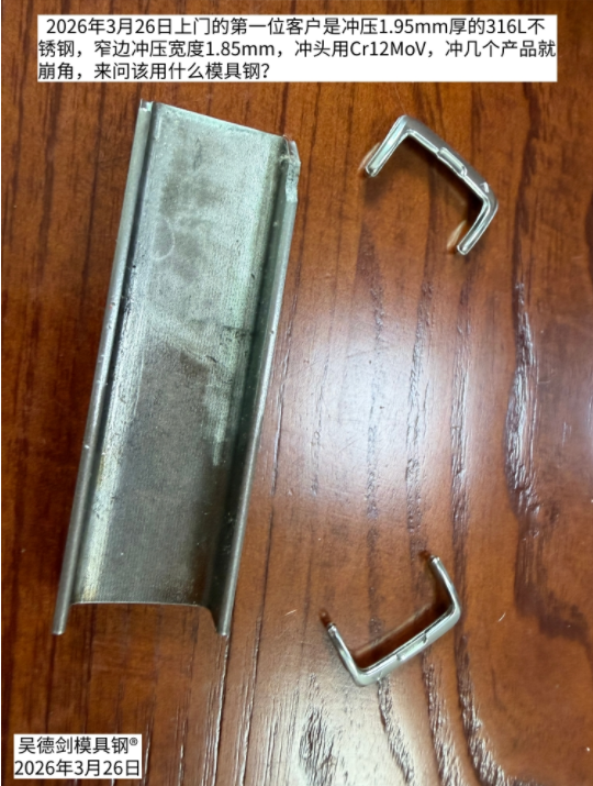 第一位他就在寮步,他带着他的模具,带着他的产品,来我公司了。他是冲压2.0的316不锈钢表带,冲头有个1.8mm的窄边冲头老是崩,冲头宽度小于板厚,冲压比例小于1:1,他现在用的模具钢容易崩冲头,Cr12MoV、D2、SKD11、 DC53都用过了,都是干几百个产品,冲头窄边处就会崩掉。实在没办法解决了,又经常看我视频,看我离得比较近(我们都是东莞市的寮步镇),就带着产品来找我了。